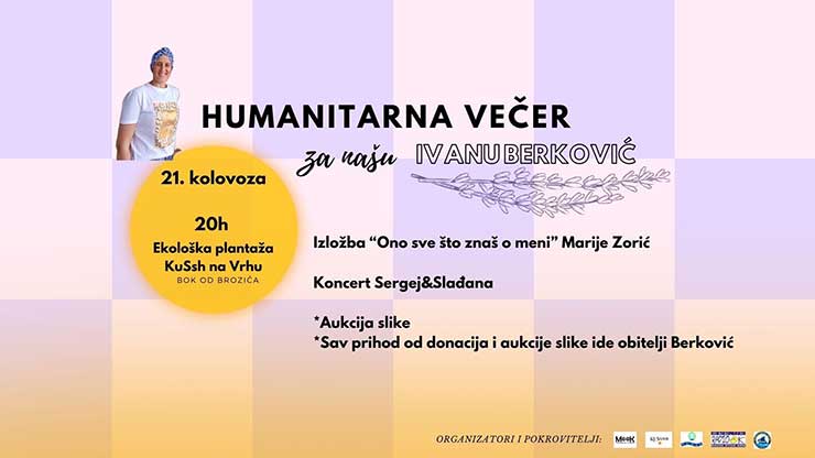 Humanitarna večer za Ivanu Berković održat će se na ekološkoj plantaži KuSshh u naselju Vrhu (Bok od Brozića), 21. kolovoza 2024. godine, s početkom u 20.00 sati. Organizatori, sudionici i pokrovitelji ove akcije ujedinili su se u ideji za prikupljanjem financijske pomoći u svrhu liječenja otočanke Ivane Berković, oboljele od karcinoma, ali i poznate kao osobe velikog srca i neizmjerne snage duha.
