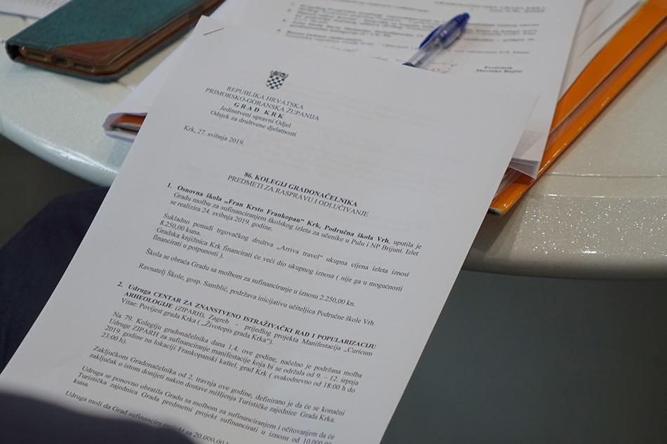 Rješavajući predmete Odsjeka za društvene djelatnosti, Osnovnoj školi Fran Krsto Frankopan - Područnoj školi Vrh, dodijeljena je potpora vrijedna 2.250,00 kn kojom će se sufinancirati prijevoz za potrebe edukativnog izleta školaraca u Pulu i Nacionalni park Brijuni. Udruzi Centar za znanstveno istraživački rad i popularizaciju arheologije - ZIPARH iz Zagreba, nastavno na zaključak sa 79. Kolegija i dopunjenu dokumentaciju zamolbe, odobrena je pomoć u iznosu od 10.000,00 kn za realizaciju manifestacije Curicum Vitae: Povijest grada Krka, a koja bi se, između 09. i 12. srpnja ove godine, trebala održati u Frankopanskom kaštelu. Riječ je o programu u čiju će se organizaciju uključiti Udruga Kreativni Krk iz Krka i Eko-udruga Vilino Polje iz Mostara, sve u namjeri da se turistima i lokalnom stanovništvu na zanimljiv i inovativan način prikaže bogata gradska povijest, od prapovijesti do danas, temeljena na arheološkim nalazima i povijesnim spisima.