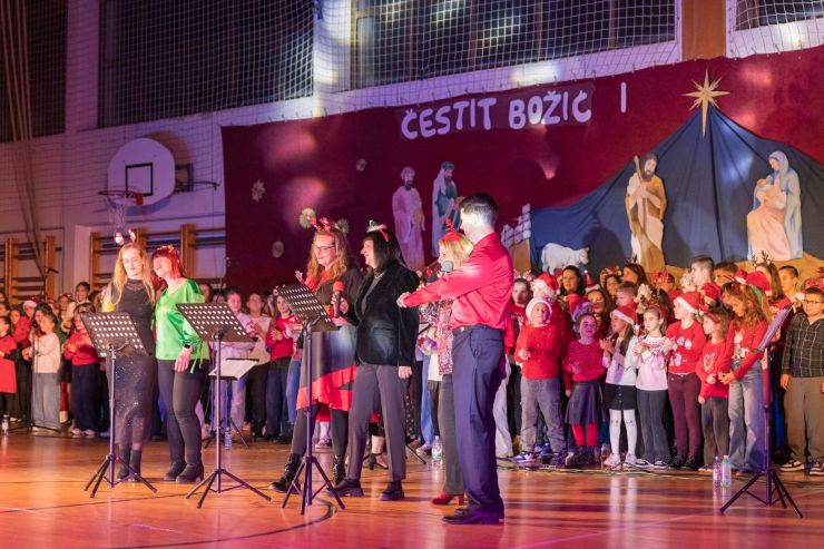 Dvoranom su se orile božićne pjesme "Ide Božić", "Kyrie Eleison", "Pristupite vjerni" i mnoge druge, a zborom učenika ravnalo je osmero učitelja Glazbene kulture i voditelja zborova: Željka Komlenac, Davor Burlović, Nariman Pavačić, Jurica Goja, Dana Bajčić, Kristina Ivošić, Ana Valković i Mara Vidučić Blečić, koji su, zajedno s djecom, otpjevali posljednju pjesmu "Božić dolazi".