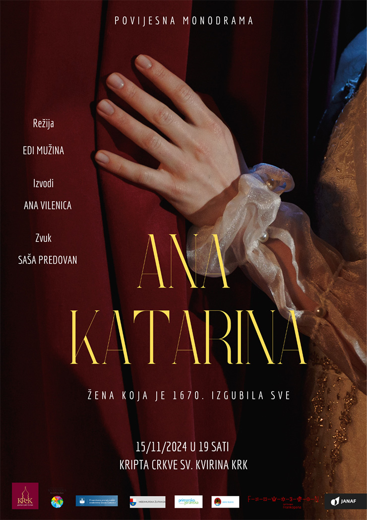 U povijesti svijeta rijetko se pojavljuju žene u prostoru javnog djelovanja, ali kada se koja od njih pojavi, tjerana vlastitom silom, onda često svoje suvremenike nadmašuje oštroumljem i veličinom svoje namisli. Dama kraljevskog garda, snažna intelektualna pojava, ljubiteljica sjaja koja je 1670. godine izgubila sve! Žena bogata i ponosna, krasna i umna, odvažna i slavohlepna, vjerna pratiteljica svih političkih djela svoga supruga Petra Zrinskog… Ona je Ana Katarina Zrinski (rođ. Frankopan), i njezin će uskoro biti Krk…