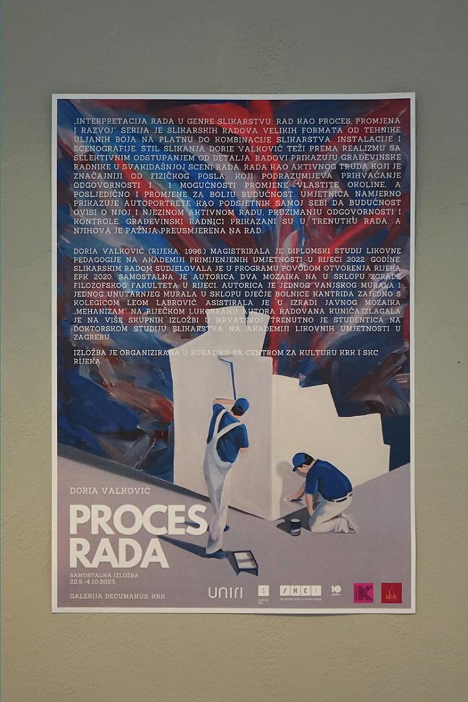 U organizaciji Udruge Kreativni Krk i Studentskog kulturnog centra Rijeka, a uz podršku Centra za kulturu Grada Krka, u krčkoj Galeriji Decumanus, 22. rujna 2023. godine, otvorena je slikarska izložba pod nazivom Interpretacija rada u genre slikarstvu: rad kao proces, promjena i razvoj mlade riječke umjetnice Dorije Valković.