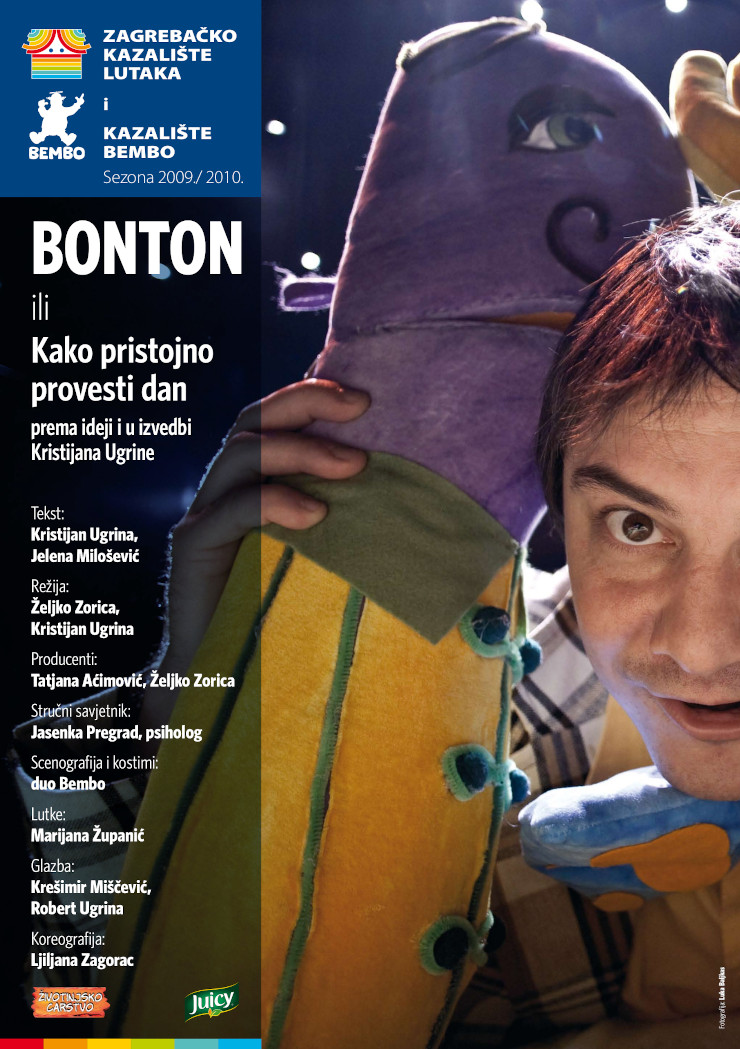 Predstava Bonton ili kako pristojno provesti dan na zabavan se i mališanima pristupačan način bavi pravilima lijepog ponašanja, ali i opasnostima koje danas vrebaju s raznih strana. O bontonu će ih poučiti izumitelj Bonko Tončić i njegov alter ego maleni lutak Macmalić. I ostali likovi (pipa, češalj, četkica za zube, žlica, vilica, nož, psić...) također su lutke koje animira jedini glumac u predstavi - Kristijan Ugrina. Zbog čega je važno djecu (i) kazališnom predstavom poučavati lijepom ponašanju? I ne samo lijepom, nego i suosjećajnom i onom koje iskazuje poštovanje i prihvaćanje drugog i drugačijeg. Jer je u toj ranoj dobi najučinkovitije uspostavljati i oblikovati životne vrijednosti. Kasniji pokušaji daju puno slabije rezultate. Jer uobičajeno upozoravanje i opominjanje djece često stvara otpor prema uputama nego što ih motivira na takvo ponašanje. Upute i pravila lijepog ponašanja iskazana kroz umjetničke metafore na zaigran i interaktivan način djecu mnogo više potiču na promišljanje i usvajanje takvog ponašanja. Predstava klasičnim bontonskim uputama dodaje i higijenske navike, ali i potiče otvorenost i suosjećanje za one s posebnim potrebama te osobnu odgovornost za brigu o prirodi i odnosima s vršnjacima, kao i drugim ljudima, a dodaje i ponešto o komuniciranju suvremenim elektronskim putovima čime prerasta svoj naziv i postaje svojevrsna orijentacija ili skup uputa za snalaženje u svijetu u kojem djeca trenutno odrastaju.