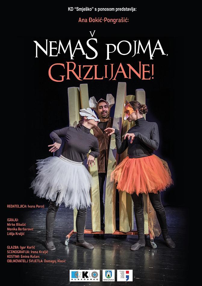 Predstava za djecu Nemaš pojma, Grizlijane nastala je prema istoimenoj knjizi, inače jednom od omiljenih lektirnih naslova spisateljice Ane Đokić-Pongrašić. U produkciji Kazališta Smješko ona je pretvorena u pravi mali mjuzikl koji govori o razmaženom i nespretnom medvjediću o kojem se čitav život brinula njegova majka, pa on nije znao ništa sam napraviti. Ipak, nakon što je krenuo u svijet, sve je, malo po malo, naučio. Ovdje je, dakle, riječ o zanimljivoj priči koja metaforički ilustrira probleme s kojima se susreću mališani pri polasku u školu, kada moraju naučiti prihvatiti odgovornost, iako bi radije ostali kod kuće na brizi svojim roditeljima. Tako je i medvjedić Grizlijan konačno morao postati samostalniji. Iako mu u početku ništa nije polazilo za rukom, u zanimljivim susretima i razgovorima sa Krokodilicom, Vranom, Ribom, Lisicom i Krijesnicama, doći će do novih i vrijednih životnih spoznaja te, konačno, postići svoj cilj! U ovoj glazbenoj predstavi redateljice Ivone Peroš, glume Mirko Ilibašić, Lidija Kraljić i Monika Berberović.