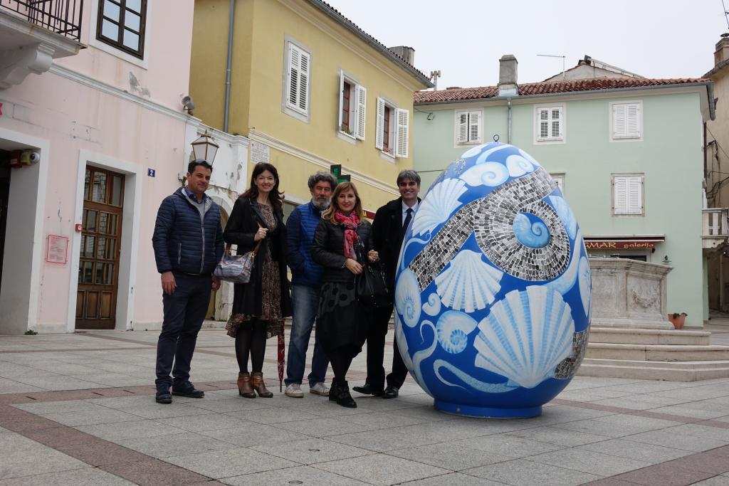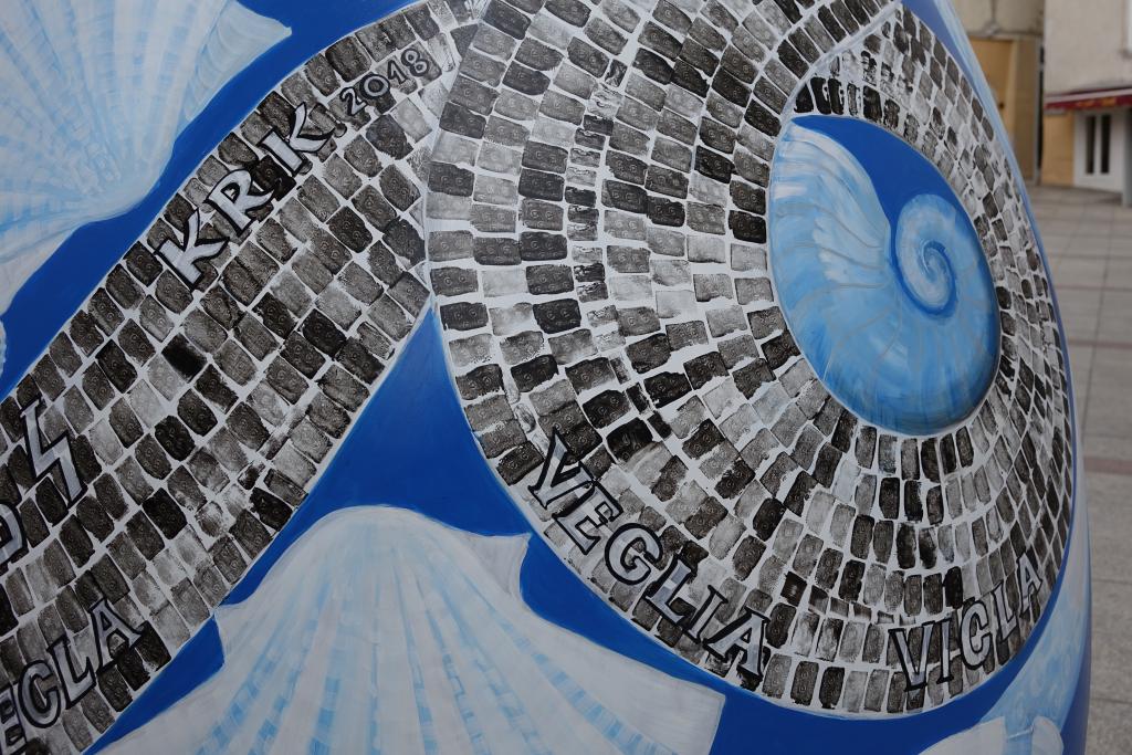Zadaća da oslika ovaj simbol novog života pripala je krčkoj akademskoj slikarici Almi Dujmović, koja je inspiraciju pronaša ne samo u morskom plavetnilu i podmorskim motivima poput stiliziranih školjki i puževa, već i poznatom antičkom mozaiku s prikazom Tritona, iskoristivši, u slikanju, karakterističan motiv njegovog (crnim pločicama istkanog) repa.