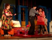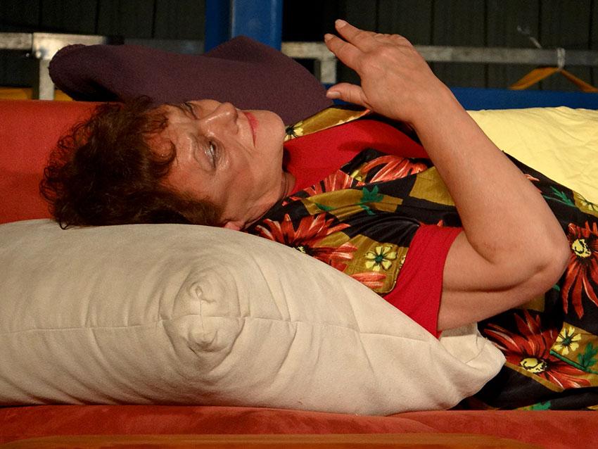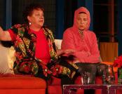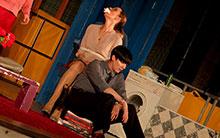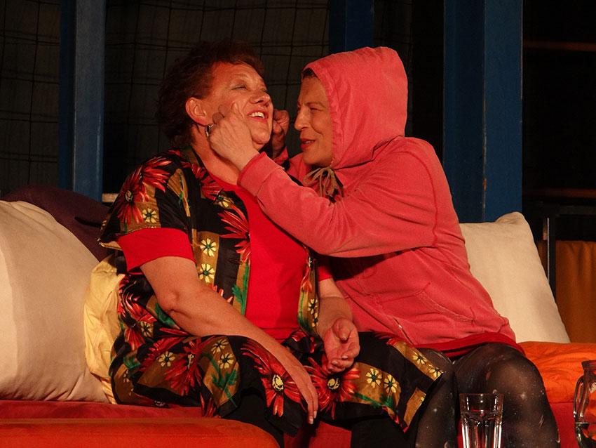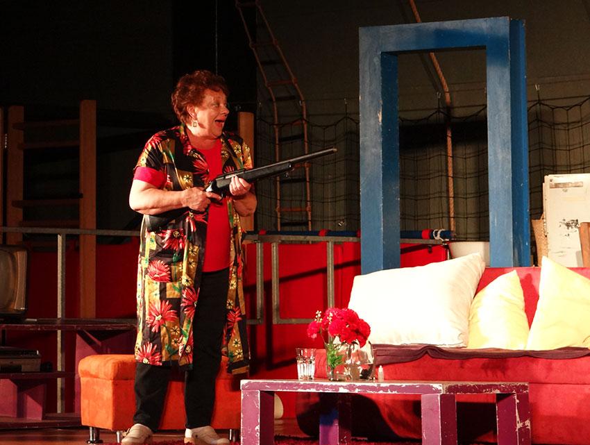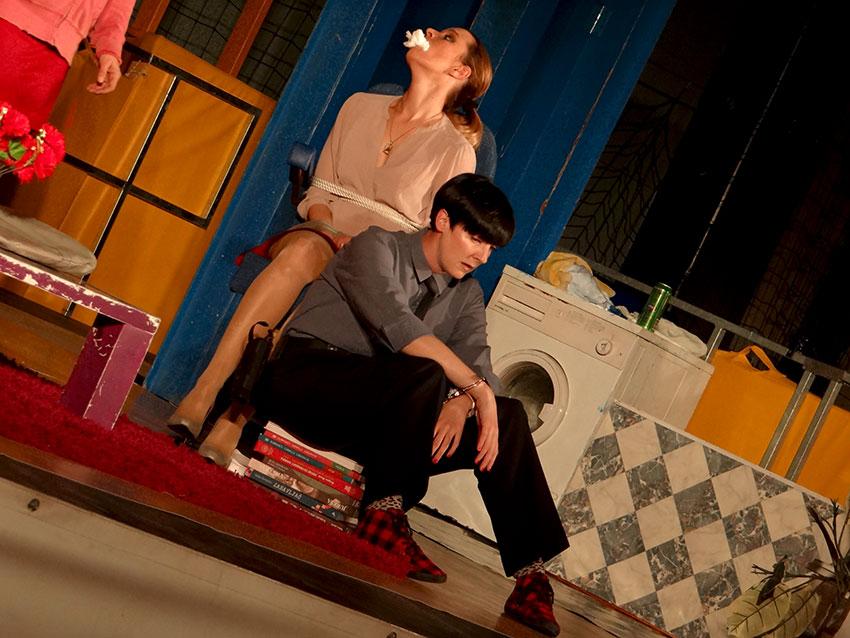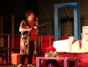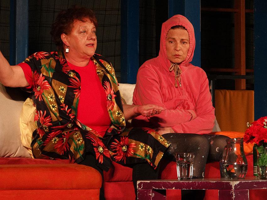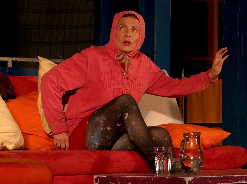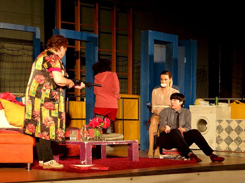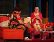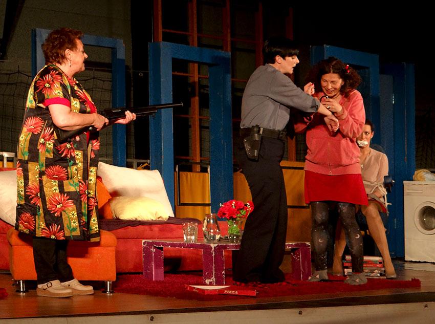 Predstava Žene u crvenom, za koju tekst potpisuje Davor Špišić, svojevrstna je crna komedija, uronjena u našu nimalo zavidnu stvarnost, koja na trenutke izravno progovara o društvu i zemlji u kojoj živimo. Naime, priča započinje u trenutku kada u stan obitelji Tamare Janković, inače prisilno umirovljene stjuardese, i njezine nezaposlene kćeri Nore upada predstavnica banke Dinka kako bi im priopćila činjenicu da imaju svega tri dana da se isele iz stana, jer se on nalazi pod hipotekarnim kreditom. No, njezinim dolaskom slijedi neočekivani zaplet! Tamara se odlučuje na radikalnu borbu protiv sustava i korporacija te naposljetku veže bankovnu službenicu, a u čitavu se priču potom uplete dobroćudna policajka Anđa, te scenu odjednom zaokupe četiri osebujne protagonistkinje koje se razumiju puno bolje nego li bismo to, obzirom na situaciju, uopće mogli pomisliti. Pred očima oduševljene publike tako su se u mahu izmjenjivale komedija, triler, socijalna drama i melodrama, točnije ovrhe, policijske opsade, glamurozan život bankarskih nasljednica, romantične uspomene stjuardesa, propale ljubavi i tipični motivi iz umirovljeničkih dana, a tu je bogatu žanrovsku riznicu, u kojoj znalački glume Vera Zima, Dubravka Ostojić, Jelena Hadži Manev i Lada Bonacci, režirala Franka Perković.