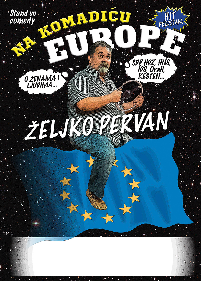 Jer Željko Pervan, kao pravi majstor improvizacije, obožavatelj Slovenaca, smrknuti profesor, zaigrani govornik i komentator hrvatske svakodnevice, kadar je iznijeti čisti humor, i to bez ikakvih rekvizita! Zato je predstava Na komadiću Europe vrhunac stand-up komedije u Hrvatskoj, referirajući se svojim sadržajem na teme poput Slovenaca i veličine njihove države, našeg ulaska u Europsku uniju, muško-ženskih odnosa, odnosa HDZ-a i SDP-a, a komentirajući i akciju Kupujmo hrvatsko. Ali čime, pita se on, uvodeći u priču o cijenama i kvaliteti hrvatskih proizvoda, ne zaobilazeći pritom ni (ne)obične kupovne navike Hrvata. Ipak, Pervan se kao kod kuće osjeća onda kada progovara o odnosima muškaraca i žena. Čim žena kaže - da, već u crkvi dobije 50 kila, a onda bi je mladoženja trebao prevesti preko kućnog praga. Čime? Viljuškarom, pita se! Međutim ne ostaje dužan ni jačem spolu, jer mi se borimo, lovimo, ulazimo u HDZ, a ipak se bojimo, i to koga - žena, priznaje u svom stilu.