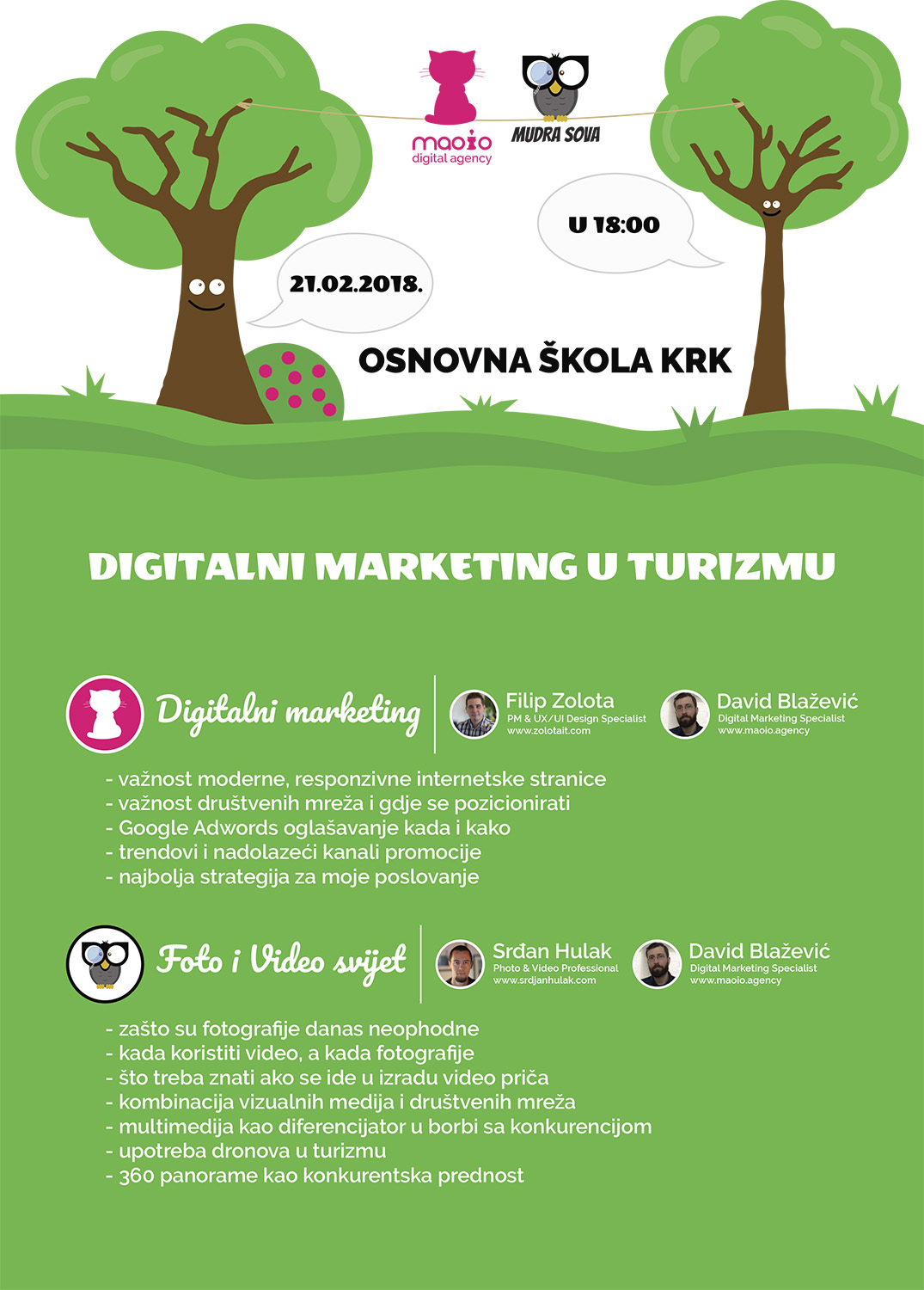 Na inicijativu obrta Mudra sova i Digitalne agencije Maoio, u prostoru Osnovne škole Fran Krsto Frankopan u gradu Krku, 21. veljače 2018. godine, s početkom u 18.00 sati, održat će se besplatan edukativni program na temu digitalnog marketinga u turizmu.