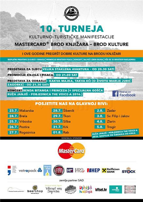 Kulturno-turistička manifestacija Brod knjižara - Brod kulture, koja ove godine slavi svoje deseto, jubilarno izdanje, jučer je na makarskoj rivi započela turneju tijekom koje će obići četrnaest jadranskih destinacija, među kojima i grad Krk, u čiju će luku uploviti 31. srpnja.