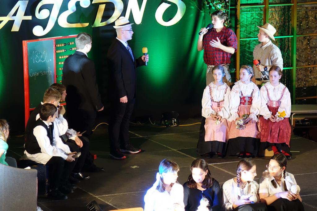U programu koji je oduševio sve okupljene, krčki školarci predstavili su svoje, pjevačko, plesačko, sviračko, glumačko i voditeljsko umijeće, a sadržajem su osim vremeplova na temu povijesti školstva te momenata iz hrvatske i svjetske povijesti uopće, bile obuhvaćene sekvence motivirane kontrastima (susret suvremenog i tradicionalnog plesa ili razgovor djeda i unuka), s time da je na kraju priča zaokružena atraktivnim teatrom sjena, a svoj je doprinos scenariju dala i umjetna inteligencija.