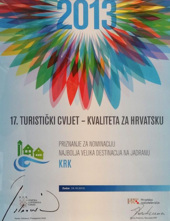 Na najvećem turističkom okupljanju, 24. i 25. listopada 2013. godine, održanom u Zadru, Danima hrvatskog turizma, gradu Krku dodijeljeno je nekoliko priznanja u akciji Turistički cvijet - Kvaliteta za Hrvatsku što je tradicionalno provode Hrvatska radiotelevizija i Hrvatska gospodarska komora, kojima se ove godine (vlastitim akcijama Čovjek - ključ uspjeha u turizmu, Doživi Hrvatsku te Eden) pridružila i Hrvatska turistička zajednica.
