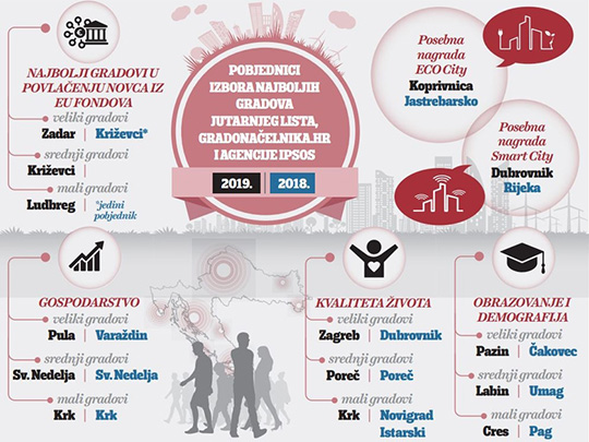 Najboljim gradovima na području gospodarstva, u kategoriji mali, srednji i veliki grad, tako su redom proglašeni Grad Krk, Sveta Nedelja i Pula, dok su Cres, Labin i Pazin pobjednici po pitanju demografske, obrazovne i socijalne politike, s time da su Krk, Poreč i Zagreb proglašeni najboljim mjestima za život, a šampionima povlačenja sredstava iz fondova Europske unije Ludbreg, Križevci i Zadar. Istaknimo, pritom, kako se ocjenjivanje gradova po pitanju ukupne kvalitete života odvijalo od strane stručnoga žirija koji je u obzir uzeo čak devet kriterija. U grupi kriterija oslonjenih na proračune gradova analizirana su, pored ostalog, budžetska izdvajanja za zaštitu okoliša, sport, kulturu i gospodarenje otpadom, a u sklopu istraživanja provedena je i anketa među građanima o kvaliteti života u njihovim sredinama. Koprivnica je Eco City titulu za najbolja rješenja u gospodarenju otpadom i zaštiti okoliša osvojila u konkurenciji Ludbrega, Čakovca, Belišća i Jastrebarskog, dok je Dubrovnik, u konkurenciji Rijeke, Varaždina, Bjelovara i Jastrebarskog, trijumfirao u kategoriji Smart City, i to za najbolju praksu i rješenja u primjeni pametnih tehnologija.