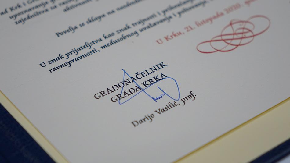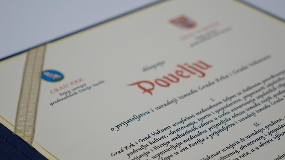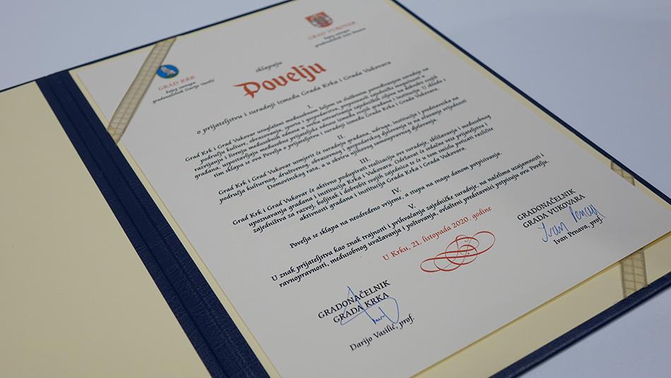 U Velikoj gradskoj vijećnici, 21. listopada 2020. godine, gradonačelnici Grada Vukovara i Grada Krka, Ivan Penava i Darijo Vasilić, potpisali su Povelju o prijateljstvu i suradnji, kojom je između ta dva grada, citirajući njezin sadržaj, usuglašena međusobna suradnja na području kulture, obrazovanja, sporta i gospodarstva.