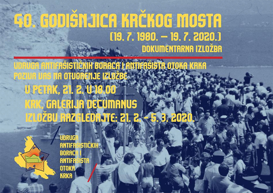 U zajedničkoj organizaciji Centra za kulturu Grada Krka i Udruge antifašističkih boraca i antifašista otoka Krka, u petak, 21. veljače 2020. godine, s početkom u 18.00 sati, u krčkoj Galeriji Decumanus otvara se prigodna fotografska izložba, i to u povodu 40. godišnjice Krčkog mosta (19. 07. 1980. - 19. 7. 2020.).