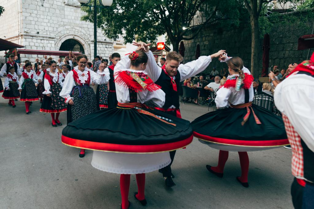 Pa, krenimo redom. Lokalna folklorna društva - Folklorno društvo Poljica, Kulturno-umjetničko društvo Vrh i Kulturno društvo Kornić - svojim nastupima na središnjem gradskom trgu Veloj placi i rivi posjetitelje su upoznali s tradicijskim krčkim plesovima i narodnim nošnjama te jedinstvenim glazbenim slogom - dvoglasjem tijesnih intervala Istre i Hrvatskog primorja - koji je kao jedan od najspecifičnijih i najkompleksnijih stilova folklorne glazbe, uopće, 2009. godine upisan na UNESCO-vu listu nematerijalne kulturne baštine čovječanstva. Dodajmo tome kako su stopama ovog prepoznatljivog folklorno-umjetničkog izričaja, u smislu priznavanja njegove kulturne i kulturološke vrijednosti, krenuli i krčki tanci (plesovi), zasluživši status kulturnog dobra Republike Hrvatske.