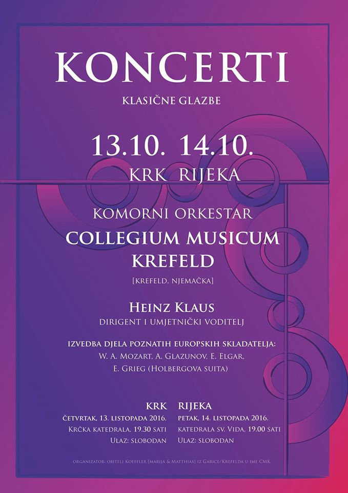 Komorni orkestar Collegium Musicum Krefeld iz sjevernonjemačkog grada Krefelda, ove će jeseni, nakon mnogih odrađenih turneja, po prvi put muzicirati i u Hrvatskoj. Krčki koncert tijekom kojeg će se predstaviti interpretacijama najpoznatijih europskih skladateljskih majstora na redu je 13. listopada 2016. godine, u Krčkoj katedrali, s početkom u 19.30 sati. Ulaz je slobodan.