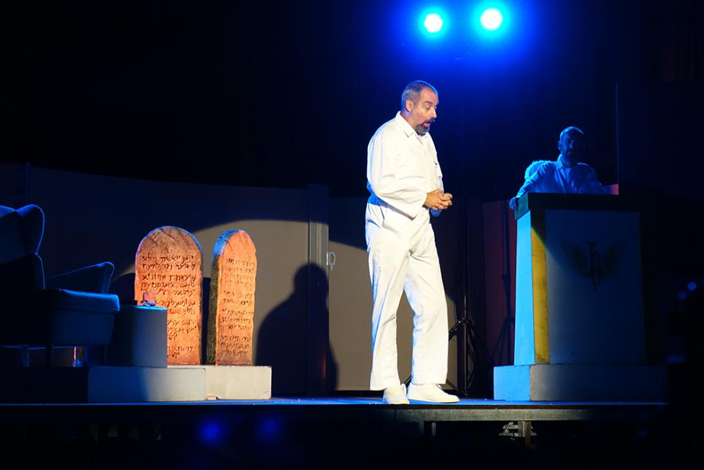 Ova predstava kreirana prema tekstu Davida Javerbauma (u originalu An Act of God), podsjetila je na sve ono što smo kroz odgoj naučili, a nismo preispitali, nasmijavši jednostavnom sintezom logike i religije. Ona je izvorno postavljena kao niz monologa uz kratke dijaloške prijelaze, stilski ponajviše podsjećajući na formu stand up-a, s fokusom na Boga kao posve senzibilno i nesavršeno biće. S obzirom da forma počiva na aktualnosti humornih sekvenci i adaptiranju lokalitetu izvedbe, autorski je tim odabrao Javerbaumov tekst kao polazište, jer posjeduje mogućnost modifikacije i prilagodbe. Predstava, dakle, nije rasplela dilemu o kokoši i jajetu, niti je istražila postoji li život nakon smrti, već je na komičan način pružila odgovore na neka dublja pitanja koja čovječanstvo muče još od čina stvaranja... U ovoj urnebesnoj komediji Bog se umorio od postojećih Deset Božjih zapovijedi te se odlučio ponovno ih napisati kako bi bile kompatibilnije današnjem trenutku, stoga je sišao na zemlju i postavio novi Dekalog prilagođen 21. stoljeću. Glavne uloge maestralno su odigrali Sven Šestak, Enes Vejzović i Janko Rakoš, utjelovivši Boga te anđele Gabrijela i Mihaela, dok je redateljski angažman povjeren Ivanu Goranu Vitezu.