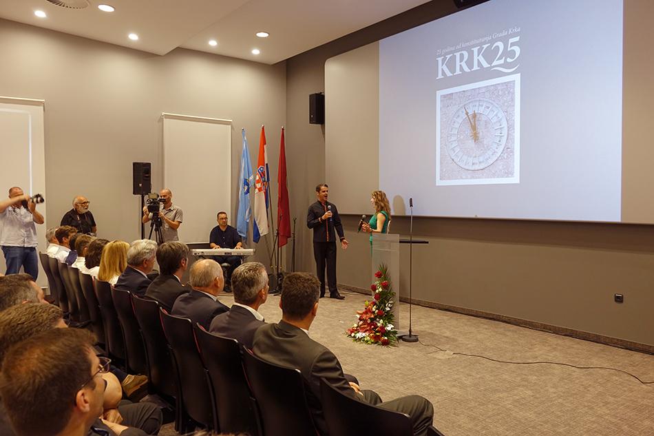 Uz prigodne nastupe Antonelle Malis i Đanija Stipaničeva kojima je klavirsku podršku pružio Vladimir Babin, okupljenima se najprije obratio gradonačelnik Darijo Vasilić predstavivši najznačajnije trenutke iz života Grada Krka u posljednjih 25 godina, prepustivši potom govornicu načelniku Općine Dobrinj Nevenu Komadini koji je čestitku uputio u ime Koordinacije otočnih čelnika, nakon čega su uslijedile prigodne riječi krčkog biskupa mons. Ivice Petanjka, ali i primorsko-goranskog župana Zlatka Komadine. Moderiranje programa povjereno je voditelju Nenu Pavinčiću.