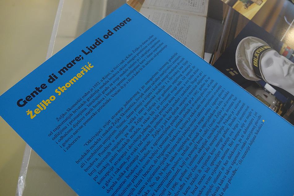 Povod izložbi kojoj danas svjedočimo, uvodi Parentić, naš je program Štorije o galiji Cristo Ressussitato posvećen krčkoj galiji koja je pod zapovjedništvom soprakomita Ljudevita Čikute prije točno 447. godina sudjelovala u čuvenoj Lepantskoj bitki. Naime, u Europi obilježavanje ove obljetnice ima sve veći značaj, te se svake godine u Nafpaktosu (Lepantu) okupljaju zemlje saveznice negdašnje Svete lige u znak sjećanja na sve poginule galijote, vojnike i posade. Sada već davne 2007. godine Hrvatsku je ondje predstavljao upravo Krk, i to kao grad čija je galija sudjelovala u toj slavnoj bitki, a ujedno i kao grad koji jedini pored Venecije ima poznat grob svog zapovjednika - Ljudevita Čikute što se nalazi pred oltarnim dijelom u glavnom brodu Krčke katedrale. Upravo taj boravak u Grčkoj i susret s delegacijama saveznica bio je povodom za detaljnije promišljanje, istraživanje i valoriziranje Krka u drugoj polovici 16. stoljeća, njegovog života i stanovništva. Stoga, baštineći bogatu kulturno-povijesnu tradiciju i prepoznavajući unutar toga iznimno pomorsko nasljeđe, 2008. godine pokrenut je projekt Štorija o galiji Cristo Ressussitato, kojim se otad obilježavaju godišnjice Lepantske bitke, i koji danas bilježi svoj mali desetogodišnji jubilej! Iznimno mi je drago da u ovome kontekstu, nastavlja Parentić, kao dio programa naše manifestacije, možemo predstaviti izložbu Gente di mare - Ljudi od mora našeg brodomaketara i kolekcionara Željka Skomeršića koji je ovom prigodom omogućio da, pored besprijekorno kreiranih maketa brodova, javnost dobije uvid i u dio njegove pomorske zbirke koji nije dijelom stalnog postava Interpretacijskog centra pomorske baštine otoka Krka kojeg Željko odnedavno vodi. Izloženi artefakti selektirani su na način da uglavnom budu vezani za grad i otok Krk, tj. za naše ljude, jer koliko god pričali o globalizaciji i širini, ishodište je uvijek u nama samima i našem kraju. Jedan od, svakako, najfascinantnijih segmenata ovog postava, primjećuje Parentić, svakako su izložene karte koje nam, uz ostalo, svjedoče i o promjeni nazivlja pojedinih lokaliteta, do čega je najvjerojatnije dolazilo prilikom prevođenja, odnosno promjena vlasti koje su zatečene nazive prevodile na svoje jezike. Osim toga, pažnju moram skrenuti i na jednu zaista raritetnu kapu z 1925. godine koja je dijelom uniforme Kraljevske ratne mornarice te na makete brodova vezanih uz naše podneblje poput leuta Složna braća, štilca ili bragoca, ali i maketu ladve - monoksilnog čamca izdubljenog tesanjem jednog ili dvaju komada debla, a koji se u pomorskom prijevozu na Kvarnerskim otocima održao do Drugog svjetskog rata. Također, kao posebno interesantan segment postava nameće se premijerno predstavljena dokumentacija koja svjedoči o nastanku krčkog brodogradilišta, a uz fotografije i nacrt, tu su i dva pismena s imenima protagonista, iz kojih je, ujedno, razvidna i administrativna strana realizacije ovog projekta iz 1933./4. godine. Prema tome, sigurni smo, da će Krčani ne samo uživati u ovoj izložbi već i doznati mnoge zanimljive pojedinosti iz bogate pomorske prošlosti grada i otoka Krka, zaključila je Parentić.