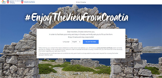 S ciljem povećanja efikasnosti prelaska granice Republike Hrvatske te upoznavanja naših gostiju s epidemiološkim mjerama koje su ovdje na snazi, Ministarstvo unutarnjih poslova i Ministarstvo turizma pokrenuli su internetsku stranicu EnterCroatia: entercroatia.mup.hr.