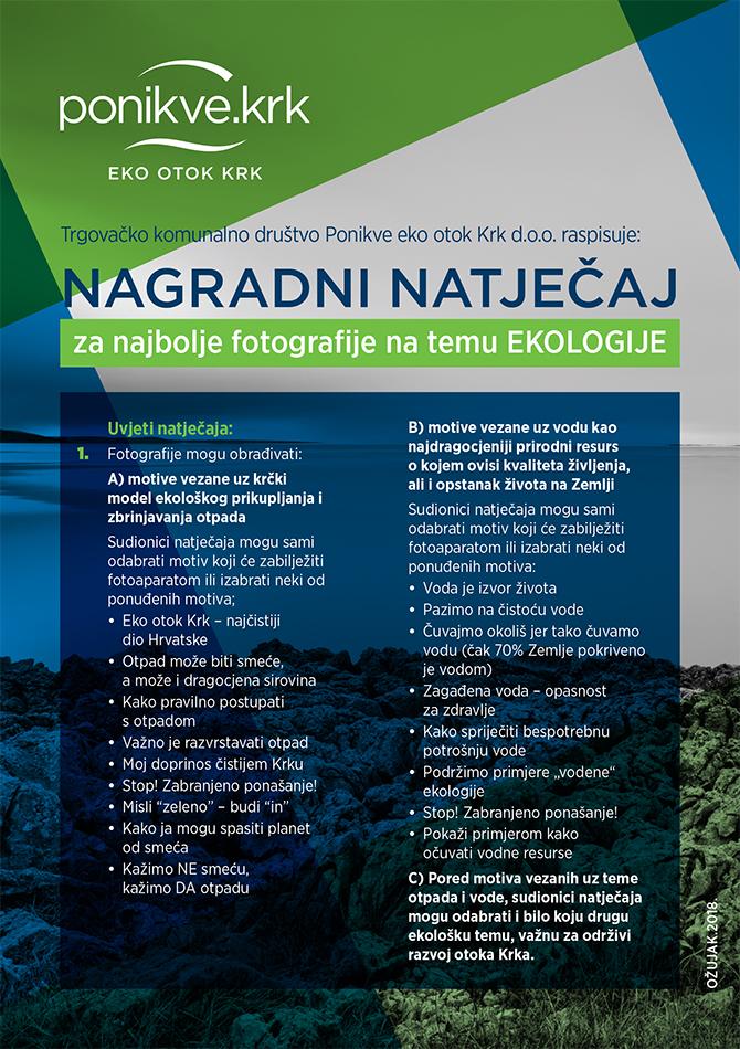 Devetu godinu za redom Trgovačko-komunalno društvo Ponikve eko otok Krk d.o.o. raspisuje nagradni natječaj za radove ekološke tematike. U odnosu na prošlu, kada je pozornost bila usmjerena prema rukotvorinama izrađenim od otpada, ove su u fokusu fotografska istraživanja djece, mladeži, odraslih, ali i profesionalnih fotografa.