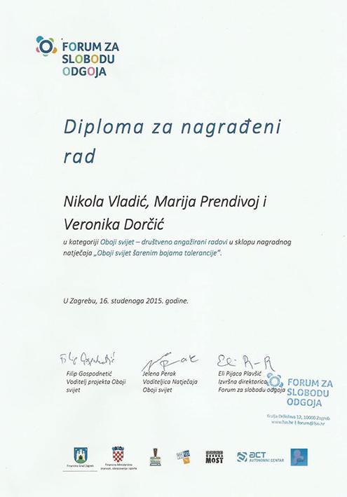 Povodom Međunarodnog dana tolerancije, 16. studenog 2015. godine, u zagrebačkom Gradskom kazalištu Trešnja održana je šesta po redu priredba tijekom koje su svečano uručena priznanja autorima najboljih radova prijavljenih na natječaj Foruma za slobodu odgoja, pod nazivom Oboji svijet šarenim bojama tolerancije.