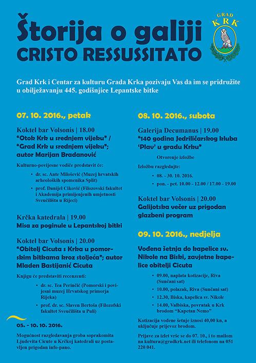 Krčka proslava 445. godišnjice Lepantske bitke započet će upravo 07. listopada, i to predstavljanjem dvaju kulturno-povijesnih vodiča - Otok Krk u srednjem vijeku i Grad Krk u srednjem vijeku - čije retke potpisuje Marijan Bradanović, a što su nedavno objavljeni u nakladi Muzeja hrvatskih arheoloških spomenika Split. Navedene će publikacije u prostoru Volsonis bara zajednički predstaviti dr. sc. Ante Milošević i prof. Danijel Ciković. Nakon mise posvećene poginulima u tom povijesno itekako relevantnom pomorskom okršaju, koja će se, kao i dosad, služiti u Krčkoj katedrali, slijedi predstavljanje knjige Obitelj Cicuta s Krka u pomorskim bitkama kroz stoljeća autora Mladena Bastijanića Cicute, čije je izdavanje u djelo proveo Centar za kulturu Grada Krka. Prema riječima recenzenta - dr. sc. Slavena Bertoše, autor je koristeći se raznovrsnim gradivom iz arhiva i postojećom literaturuom, ovim rukopisom osvijetlio važan segment krčke prošlosti: povezanost s obitelji Cicuta koja je u povijesti jadranskog i sredozemnog prostora odigrala vrlo značajnu, a dosad nedovoljno istraženu i relativno slabo poznatu ulogu. Knjiga, stoga, predstavlja prvo sustavno i detaljno istraživanje te prvu monografiju o navedenoj obitelji, koja donosi niz novih podataka te ih znalački uklapa u suvremeni kontekst krčke povijesti i kulture, čime daje nov i divljenja vrijedan stručni doprinos regionalnoj i nacionalnoj historiografiji, ali i svima onima koje zanima naše kulturno-povijesno nasljeđe i njegovo čuvanje za buduća pokoljenja. O knjizi će, također u Volsonis baru, kazivati recenzenti dr. sc. Slaven Bertoša i dr. sc. Tea Perinčić.