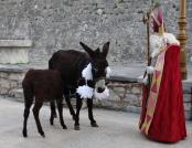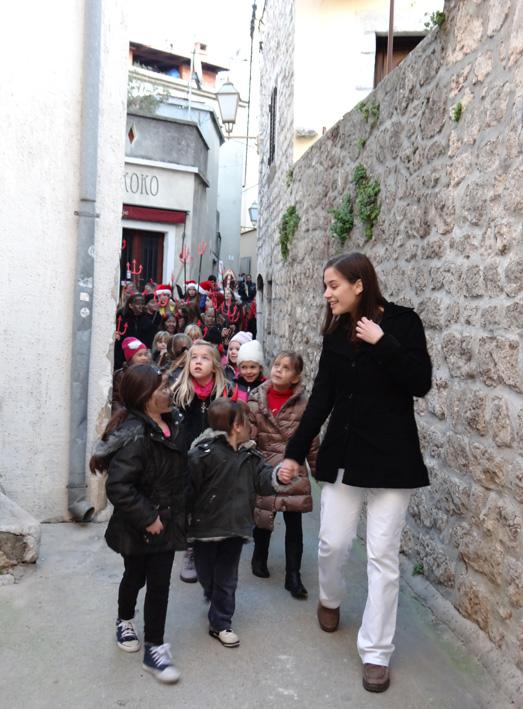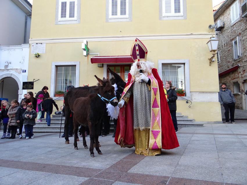 Milosrdni svetac, kojeg su ovom prigodom, po prvi put, pratila dva simpatična magarčića, u društvu krampusa, raspoloženih limenjaka i malenih pjevača, krenuo je, praćen glazbom, ulicama starog grada prema moru gdje su ga dočekali mnogi već pomalo nestrpljivi mališani. Nakon kratkog zadržavanja na Rivi brojna je povorka predvođena krampusima krenula put Vele place, gdje su najznatiželjniji imali priliku pozdraviti i popričati s omiljenim svecem, ali i pomaziti Nikoline pitome magarčiće. Ondje su svoje glazbeno umijeće, izvevši nekoliko pjesma posvećenih Nikoli i gradu, demonstrirali naši Mići Boduli.