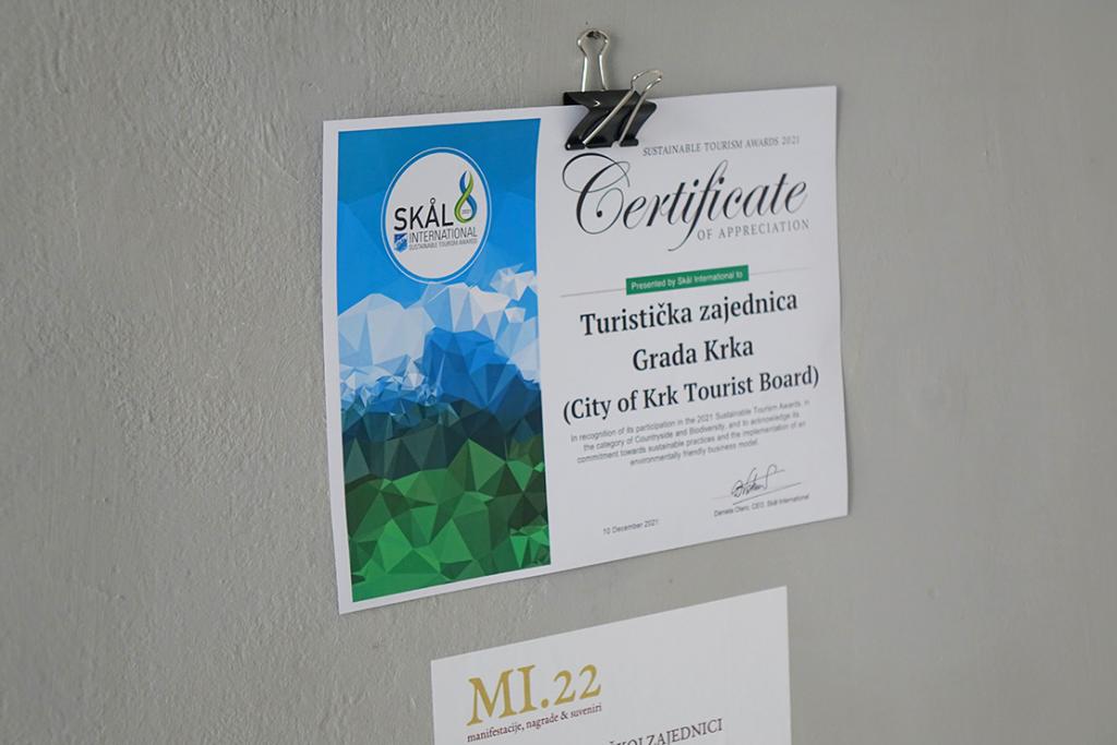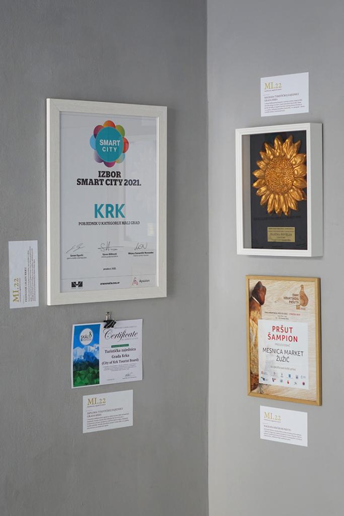 U dijelu rezerviranom za prezentaciju najrecentnijih nagrada, svoje je mjesto zaslužilo prošlogodišnje nacionalno priznanje dodijeljeno Gradu Krku kao najboljem malom gradu u kategoriji Smart City. Turističkoj zajednici Grada Krka za projekt Camino Krk uručena je jedna od nagrada Suncokret ruralnog turizma Hrvatske za 2021. godinu, i to u kategoriji aktivni turistički sadržaji u ruralnom prostoru. Također, taj je, na internacionalnoj sceni, sve vidljiviji projekt, u kontekstu prošle godine priređenih Međunarodnih nagrada za održivi turizam, u kategoriji Ruralna područja i biološka raznolikost, pozicioniran na visoko treće mjesto. Krčki pršut Mesnice-marketa Žužić na posljednjim Dana hrvatskog pršuta održanim u Splitu po drugi je put ovjenčan prestižnom titulom šampiona.