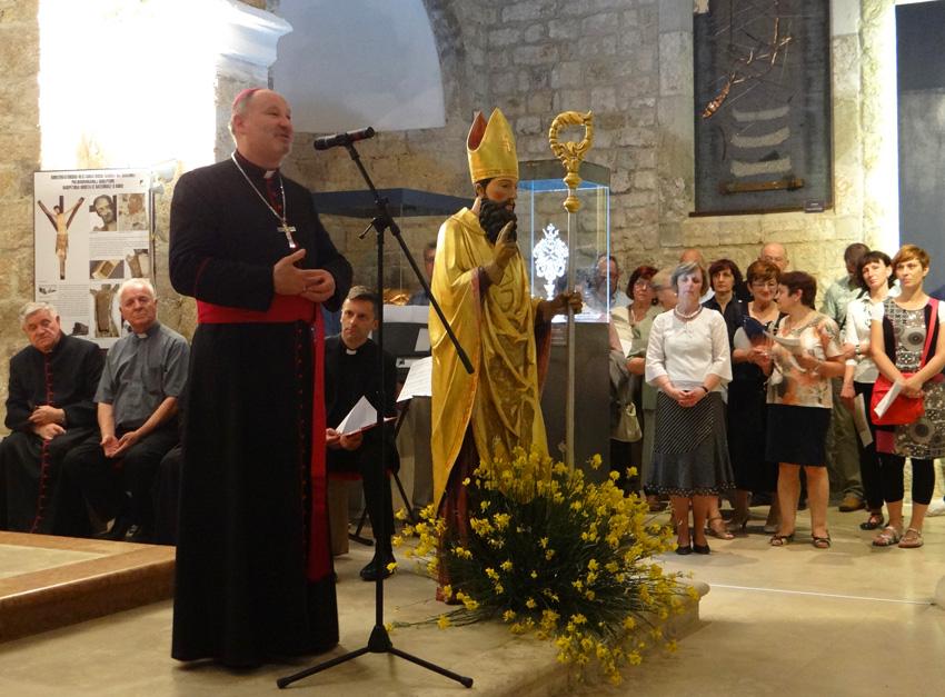 Kroz izložbu okupljene je ukratko proveo prof. Rober Mijalić, ukazavši najprije na ulomke oltarne pregrade iz 9. stoljeća smještene na samom ulazu u crkvu koji pripadaju tradiciji pletene ornamentike naglašene geometrizacije te u načinu likovne interpretacije još uvijek bliske bizantskom pristupu izražavanju. Iz perioda gotike, odnosno 14. stoljeća, nastavlja Mijalić, na izložbi je kao centralni izložak predstavljeno monumentalno raspelo, u čijem se oblikovanju već primijećuje odvajanje od bizantskog naslijeđa i kretanje prema zapadnoeuropskom načinu prikazivanja koje u svojoj osnovi ima naglašen aspekt autorstva. Potom slijedi primjer također gotičkog antependija, inače rad venecijanske zlatarske radionice, kao jedno od najvrijednijih djela zastupljenih na ovoj izložbi, čemu u prilog ide i njegova povezanost s plemenitaškom obitelji Frankopan. Značajn dio izložbe čini dionica vrijednih relikvijara ili moćnika koji nam demonstriraju svu vitalnost vjere naših ljudi. U takvom praćenju likovnog izražavanja, zaključuje Mijalić, dolazimo do vremena 20. stoljeća koje je predstavljeno slikama iz župne crkve u Osoru, odnosno dvijema postajama križnog puta od kojih je ona s naglašenim elementom naturalizma djelo Jadranke Fatur, a druga simbolički interpretirana rad Živka Haramije, dok je među njih postavljeno raritetno raspelo Valerija Michielija koje se unatoč suvremenom i minimalističkom pristupu, svojom impostacijom, snažno vezuje uz gotičku tradiciju.