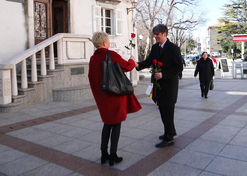 Kao u mnogim hrvatskim gradovima, tako i u Krku Međunarodni dan žena obilježen je posve prigodno - akcijom podjele crvenih ruža što su ih, uz čestitke i pokoji kompliment, gradonačelnik Darijo Vasilić u društvu svog zamjenika Čedomira Milera i djelatnika Grada Krka Vedrana Hajdina, na glavnom gradskom trgu tradicionalno darivali svojim sugrađankama.