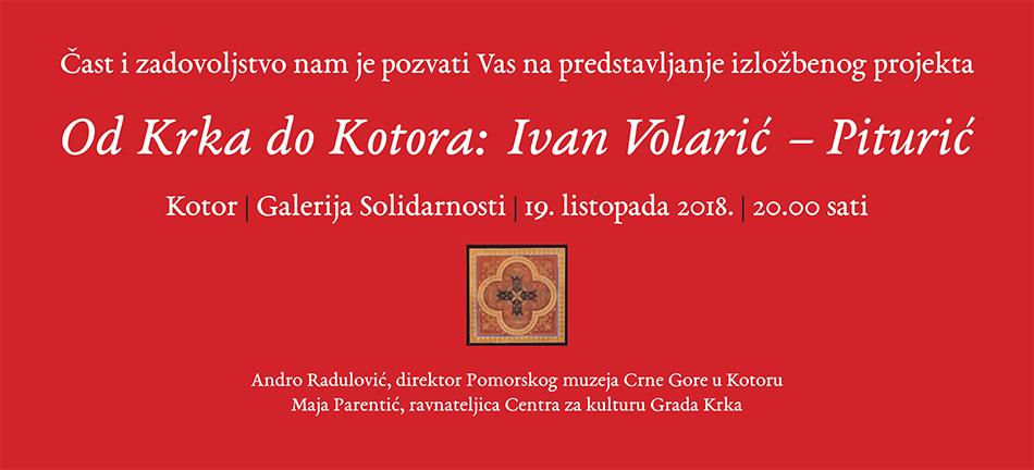 Kao rezultat suradnje Centra za kulturu Grada Krka, Biskupije Krk, Pomorskog muzeja Crne Gore u Kotoru i Opštinske javne ustanove Muzeji Kotor, u Galeriji Solidarnosti u Kotoru, 19. listopada 2018. godine, s početkom u 20.00 sati, otvara se izložba Od Krka do Kotora: Ivan Volarić Piturić, posvećena životu i djelu javnosti uglavnom nepoznatog otočnog slikara i dekoratera Ivana Volarića.