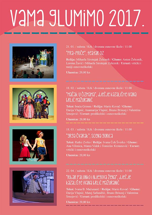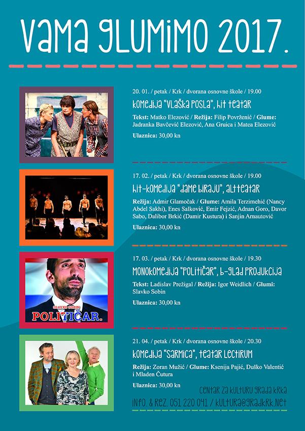 Krčki Centar za kulturu, od siječnja 2017. godine, iznova započinje s realizacijom projekta Vama glumimo! kojim će biti obuhvaćeni kazališni programi za djecu i odrasle, a odvijat će se sve do travnja, i to trećeg petka i subote u mjesecu, s time da je petak rezerviran za gostovanja predstava namijenjenih odraslima, dok je subota posvećena djeci.