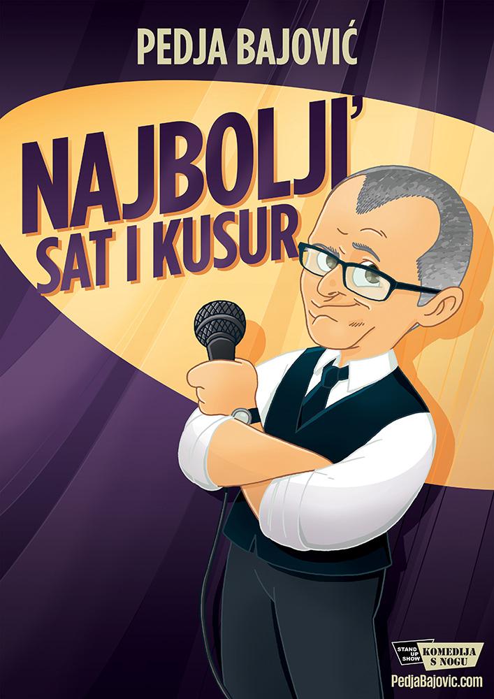 Prvih 15 godina života i rada Pedje Bajovića u stand-up komediji rezultiralo je s tri tematske cjelovečernje predstave: S NOGU (sredstvo za protiv jugonostalgije i jugofobije), MUŠKARAC (o parenju i razmnožavanju) i Rok trajanja. Na samu 15. godišnjicu od svog prvog nastupa, Pedja je odlučio pred publiku prvi put izaći s kompilacijskom predstavom koju je nazvao NAJBOLJI' sat i kusur, a u kojoj se nalaze njegove fore koje su najviše nasmijale publiku - u našem dijelu svijeta, ali i šire: ko je blesaviji, Amerikanci ili Englezi…ili Japanci... ili mi; koja je razlika između Bosanke i Hercegovca u krevetu ili u novčaniku; jesu li Kosovari muzikalniji od ostalih i zašto Crnogorac još ne spava; koliki je IQ zaljubljenog muškarca; koliko to glasova ima žena; jesu li djeca početak kraja ili kraj početka; starenje je prirodna pojava ili međunarodna zavjera; koji je zvuk gori: krc ili klik; zašto žene žive duže od muškaraca... Još više pitanja i još manje odgovora dobit ćete u ovom druženju s Pedjom. Čujte i počujte njegov umorni pjev! Nije labuđi, već nekako više - gavranov. Strah, bol, tuga… i sat i kusur smijeha!