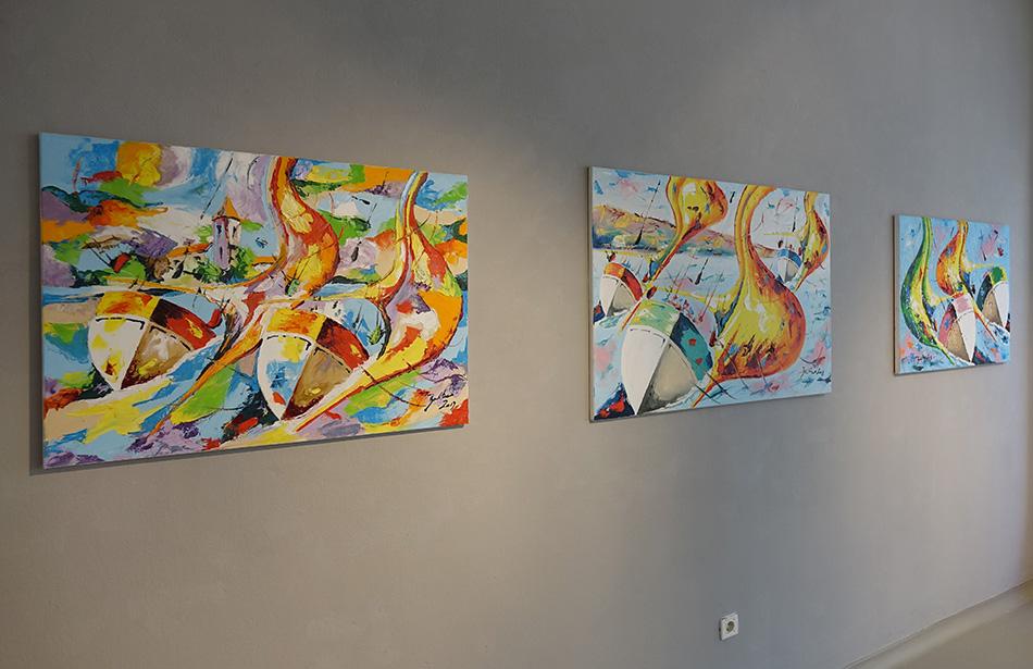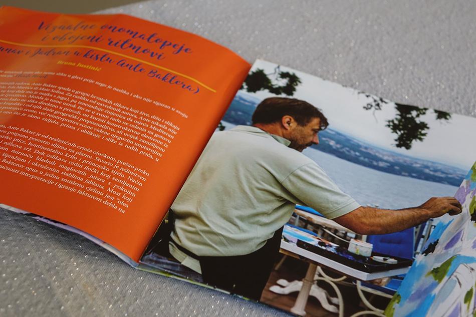 Prema riječima kustosice izložbe Brune Justinić, koja ujedno potpisuje i predgovor kataloga, Ante Bakter spada u grupu hrvatskih slikara koji žive, dišu i slikaju primorje, poput Mladena Veže, Eda Murtića ili Mate Solisa. No, za razliku od njih, Ante nikada nije živio uz more (ime tipično za taj kraj dala mu je majka s juga), pa iznenađuje činjenica da osjeća Mediteran te ga vjerno prenosi i bez da ga je (pro)živio. Možda je tome uzrok što se u svom radu ne oslanja na gotovu scenu koju preslikava na platno, već koristi konstruktivne elemente iz realnosti karakteristične za određene krajolike te od njih slaže geografski prepoznatljivu, ali uvijek zamišljenu vizuru. Drugim riječima, zapamćeno ne prenosi eidetski, već reinterpretira scene viđene njegovim unutarnjim okom. A unutarnje oko ne pamti samo ono što je sâmo vidjelo, već prima i oblikuje i slike iz tuđih priča, u Antinom slučaju majčinih. Počevši slikati još u vrijeme školskih dana, primjećuje Justinić, Ante Bakter je od realističnih crteža olovkom, prešao preko pastela, da bi se zadnjih dvadesetak godina gotovo potpuno posvetio uljima na platnu. Stvorio je tako jedinstven slikarski opus koji spaja dva suprotna kraja hrvatske ptice: kontinentalno krilo i primorsko tijelo. Međutim, način slikanja ove dvije regije je posve drugačiji, kao i njihova srž. Dok oslikava rodni iločki kraj zemljanim zagasitijim tonovima, suzdržani izražaj prenosi nam mirnoću hladnih maglovitih jutara s pokojim usamljenim čamcem u riječnim rukavcima obraslima šipražjem i okruženim stablima jablana. Most koji spaja zemlju i more, kolorit sjevera i juga te objedinjuje Baktrov opus u jednu smislenu cjelinu jest olea croatica, vremenita maslina koja mu pruža nebrojene mogućnosti interpretacije i igranje fakturom debla na koje ga je inspirirao spomenuti Mladen Veža. Riječni čamci početak su njegovog umjetničkog istraživanja, tumači nadalje Justinić, koje ga je dovelo do potpunog gestualnog oslobođenja i hrabre upotrebe blistavih nijansi, debelog nanosa sirove boje i izraženog impasta pri slikanju morskih brodica (možda bi ispravnije bilo reći brodskih pramaca) koje su bez iznimke prikazane tipično bakterovski frontalno. Snažan slikarski pokret i fuzija jakih koloriteta pruža gledatelju pravo vizualno uzbuđenje, dodatno naglašeno i simboličkim značenjem motiva koji oduvijek predstavlja avanturu, putovanje, slobodu. Prove brodova izranjaju iz nemirne površine velikog plavetnila, pri čemu je gledatelj uvučen u iluzionistički prostor slike. Nismo sigurni dolaze li barke k nama na kopno ili smo pak dio te beskrajne utrke gledajući s krme sve one koje smo ostavili iza sebe? Ipak, barke ne izgledaju prijeteće, već sigurno i postojano, kao da će preživjeti svaku oluju.