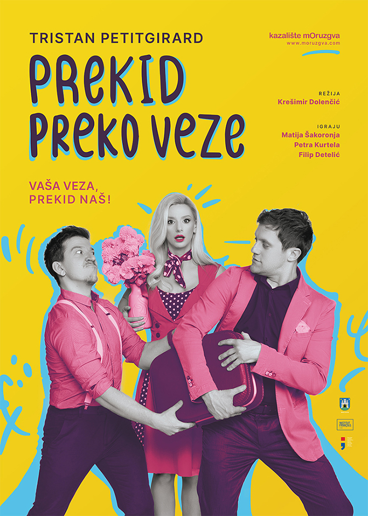 Nakon što je osvojio kazališne daske diljem Europe, Prekid preko veze autora Tristana Petitgirarda krenuo je osvajati i Hrvatsku. Ova urnebesna postromantična komedija rasprodala je dvorane diljem Hrvatske, a neke i po nekoliko puta, ponijevši nagradu za najbolju predstavu prema ocjeni žirija na prošlogodišnjem ZAKAJ-festu. Publika i kritika slažu se da je ovo jedan od najduhovitijih i najdinamičnijih kazališnih komada sezone, predstava za koju se redovito traži karta više. Prekid preko veze prati priču o specijaliziranoj agenciji koja za svoje klijente preuzima neugodne razgovore o prekidu veze, pretvarajući ih u niz humorističnih situacija, iznenađenja i nesporazuma. Uz glumce - Matiju Šakoronju, Petru Kurtelu i Filipa Detelića, koji su svi redom dobitnici prestižne Nagrade hrvatskog glumišta, redatelj Krešimir Dolenčić donosi energiju i kreativnost koja osigurava zabavu do posljednje minute. Karte se nerijetko rasprodaju i po nekoliko tjedana unaprijed, što potvrđuje kako ova komedija nije samo prolazni hit, već predstava koja svojom svježinom i humorom uveseljava publiku svih generacija. Ne propustite priliku za smijeh, zabavu i jedinstvenu kazališnu večer.